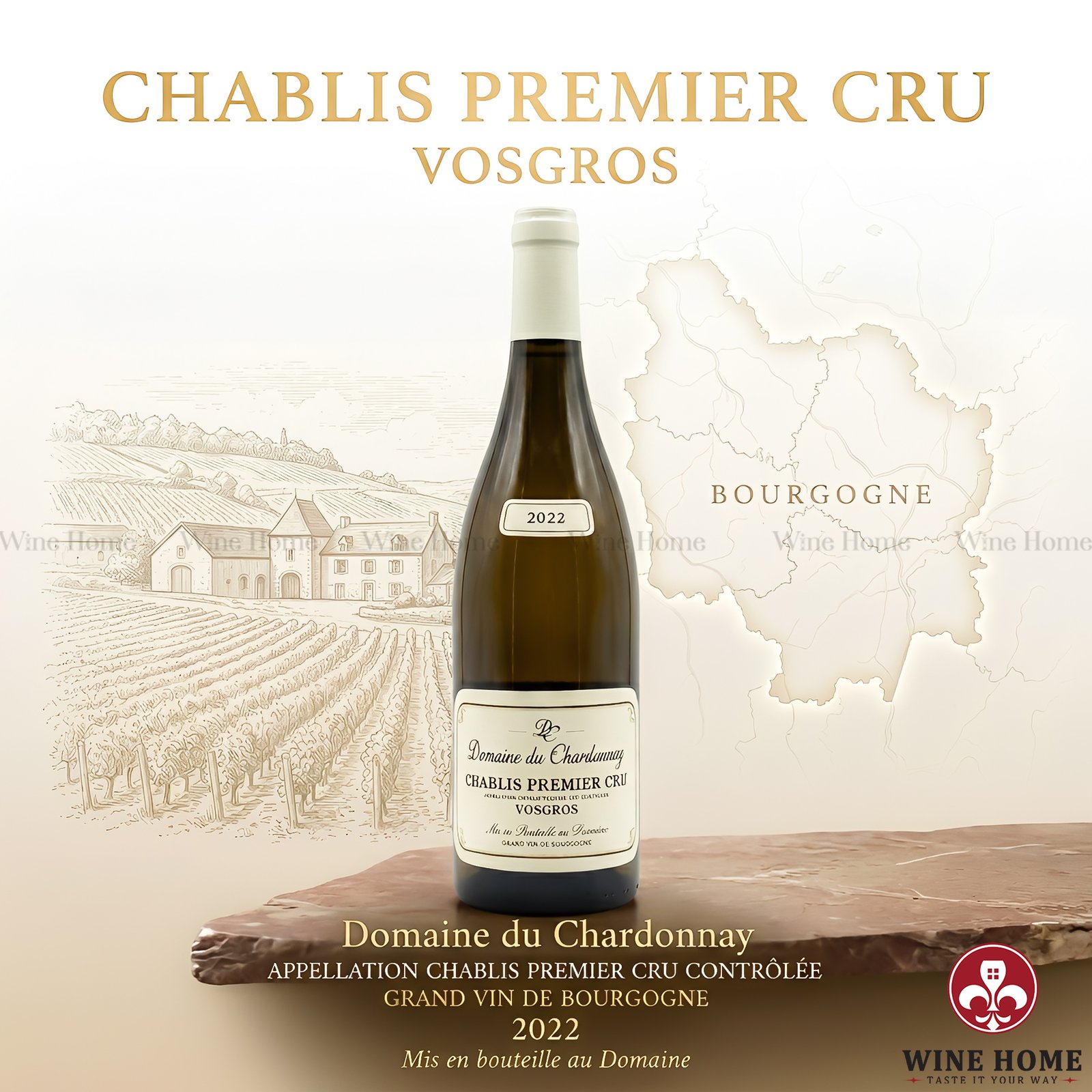 Chablis Premier Cru Vosgros 2022 là dòng vang trắng cao cấp đến từ nhà sản xuất Domaine du Chardonnay, thuộc phân hạng Premier Cru trong hệ thống phân loại danh giá của vùng Burgundy, Pháp.