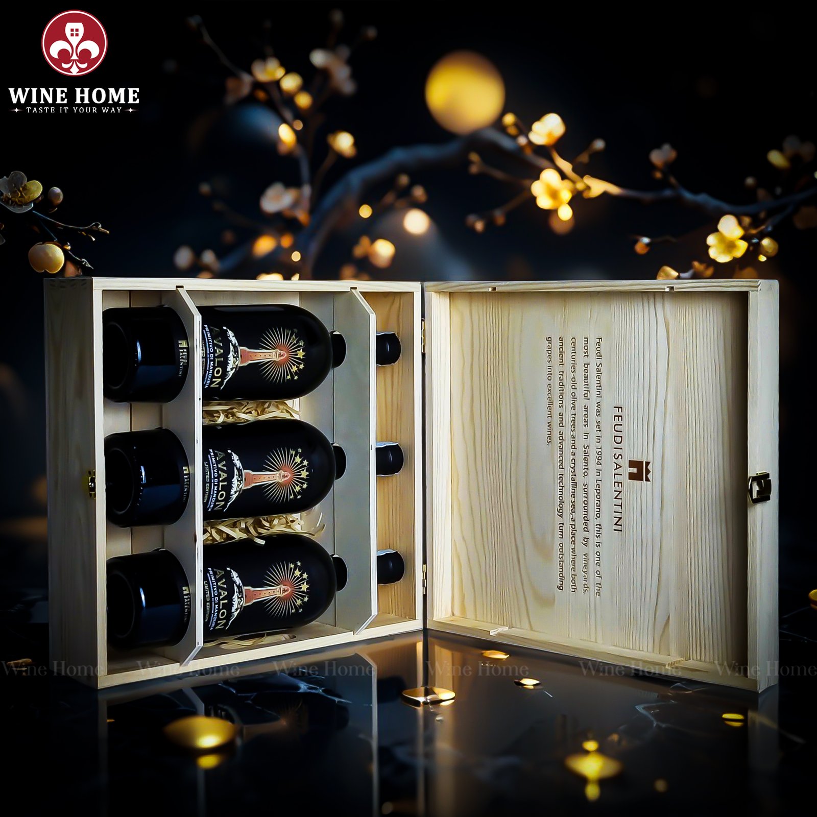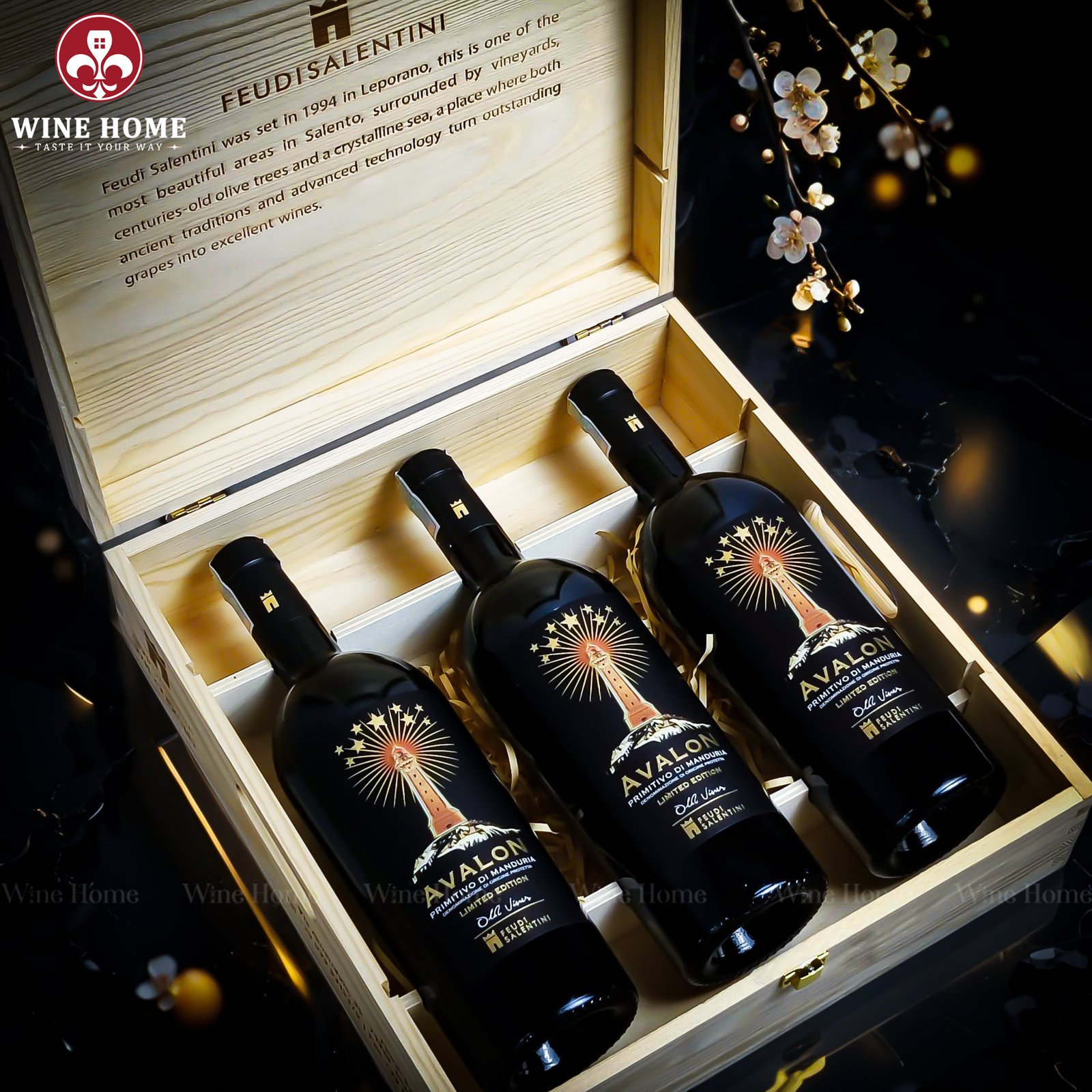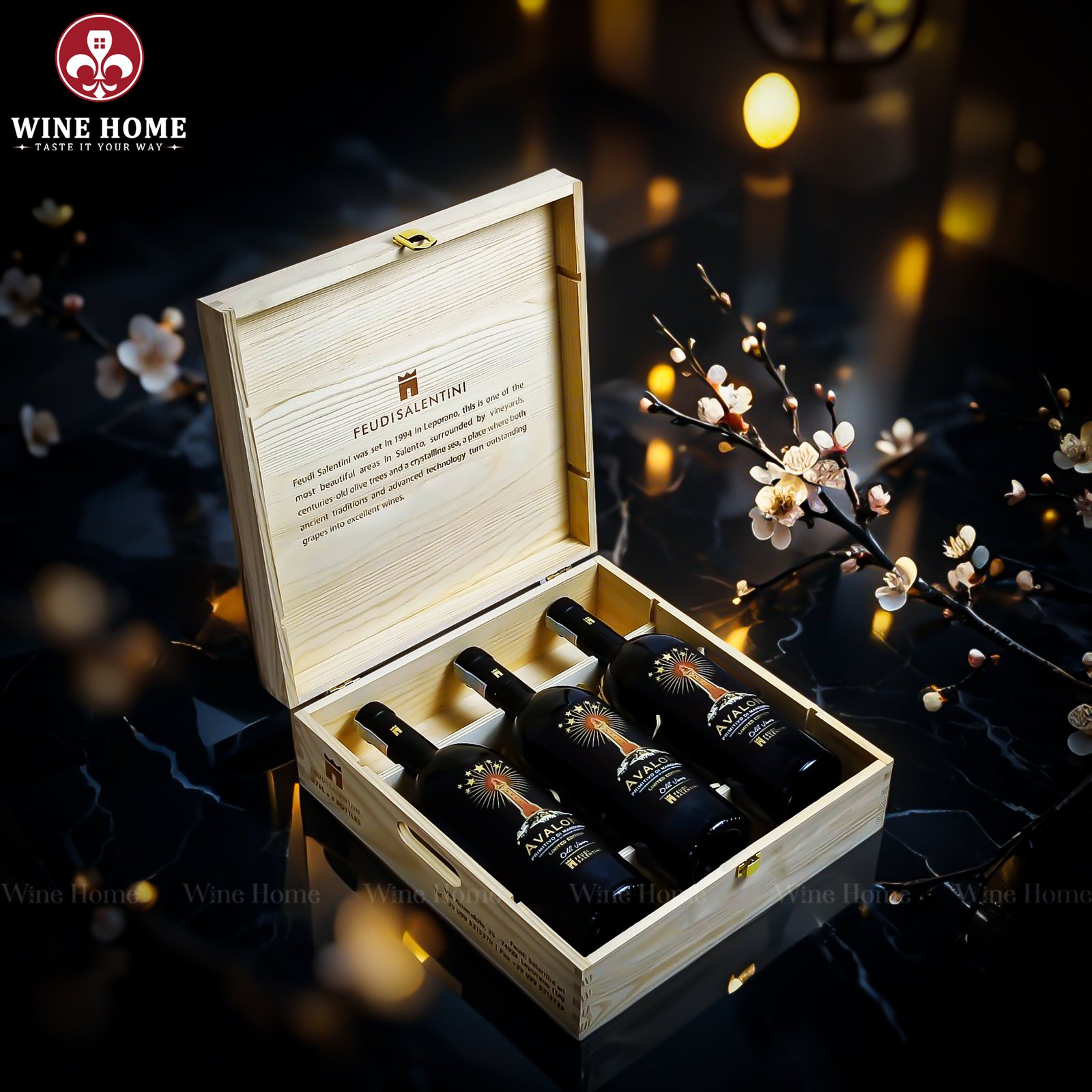 Hộp quà rượu vang 3 chai Feudi Salentini phiên bản hộp gỗ tại WineHome không chỉ là sản phẩm, mà còn là giải pháp quà tặng trọn vẹn giá trị.