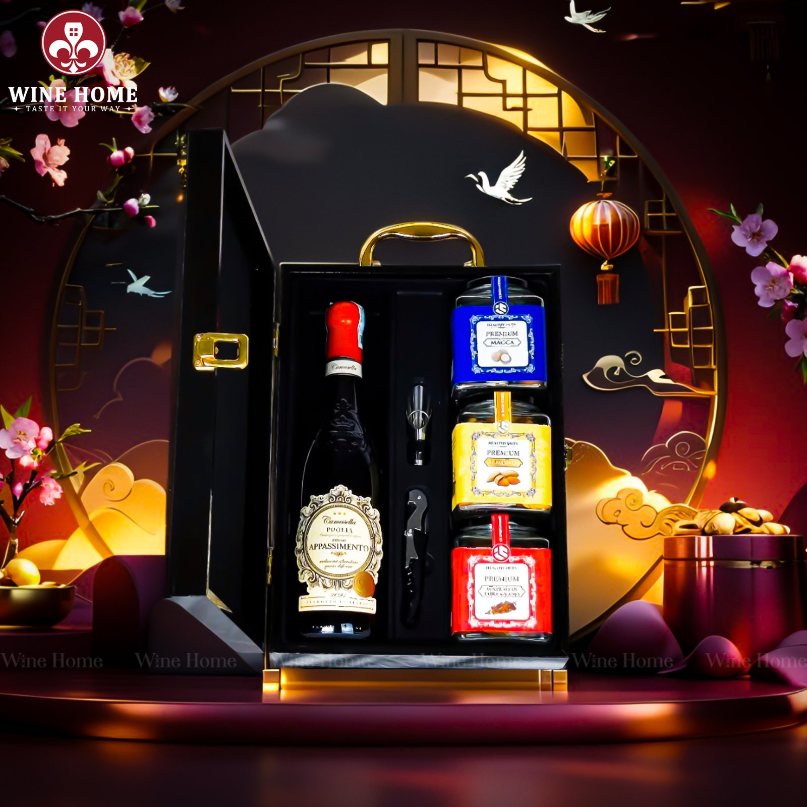 Bộ quà tết rượu hạt hộp gỗ sơn mài Wine Home gồm: