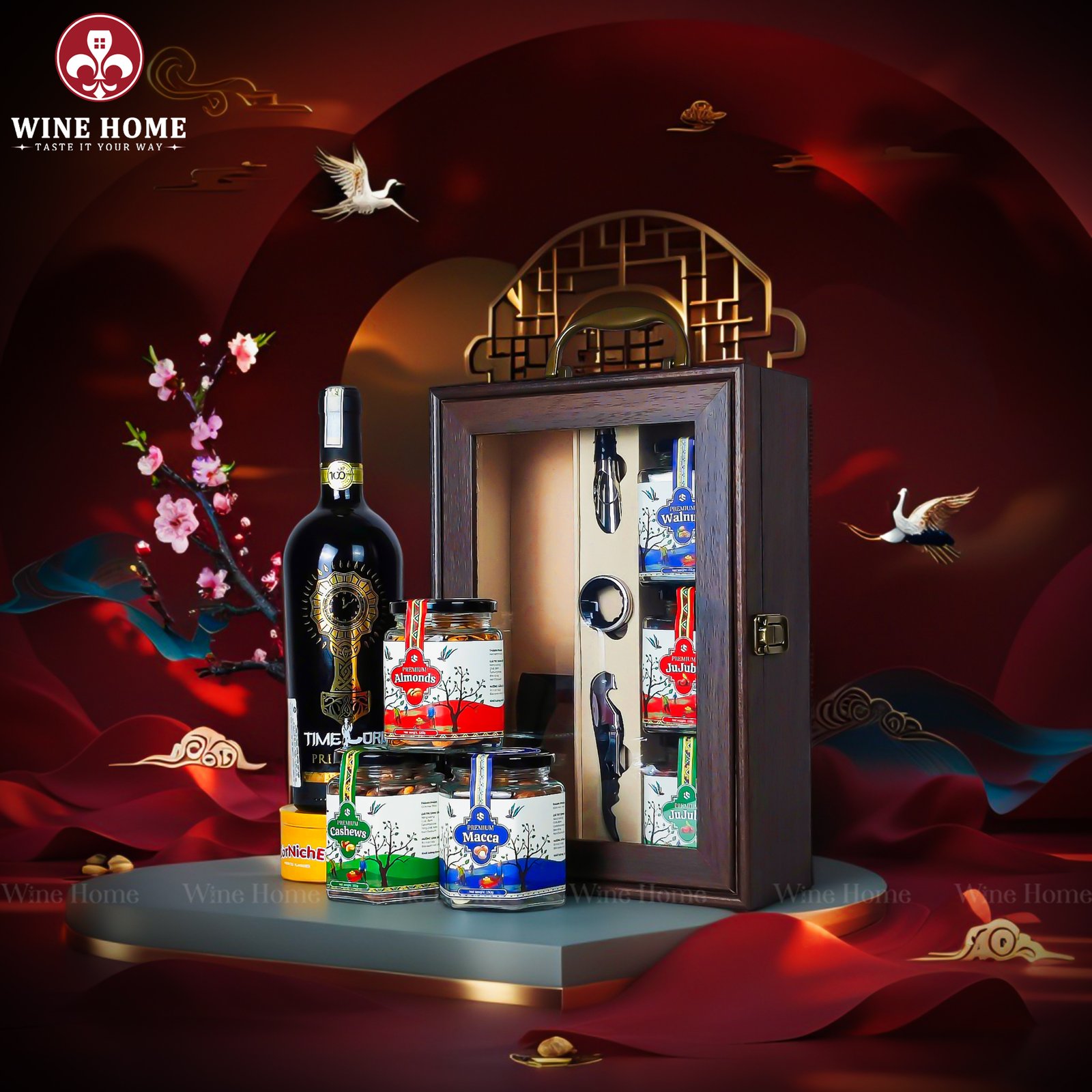 Tất cả được sắp xếp cân đối trong không gian hộp gỗ cao cấp, kèm bộ phụ kiện mở rượu chuyên dụng, giúp người nhận có thể thưởng thức trọn vẹn hương vị của rượu vang và hạt dinh dưỡng trong dịp sum họp đầu xuân.