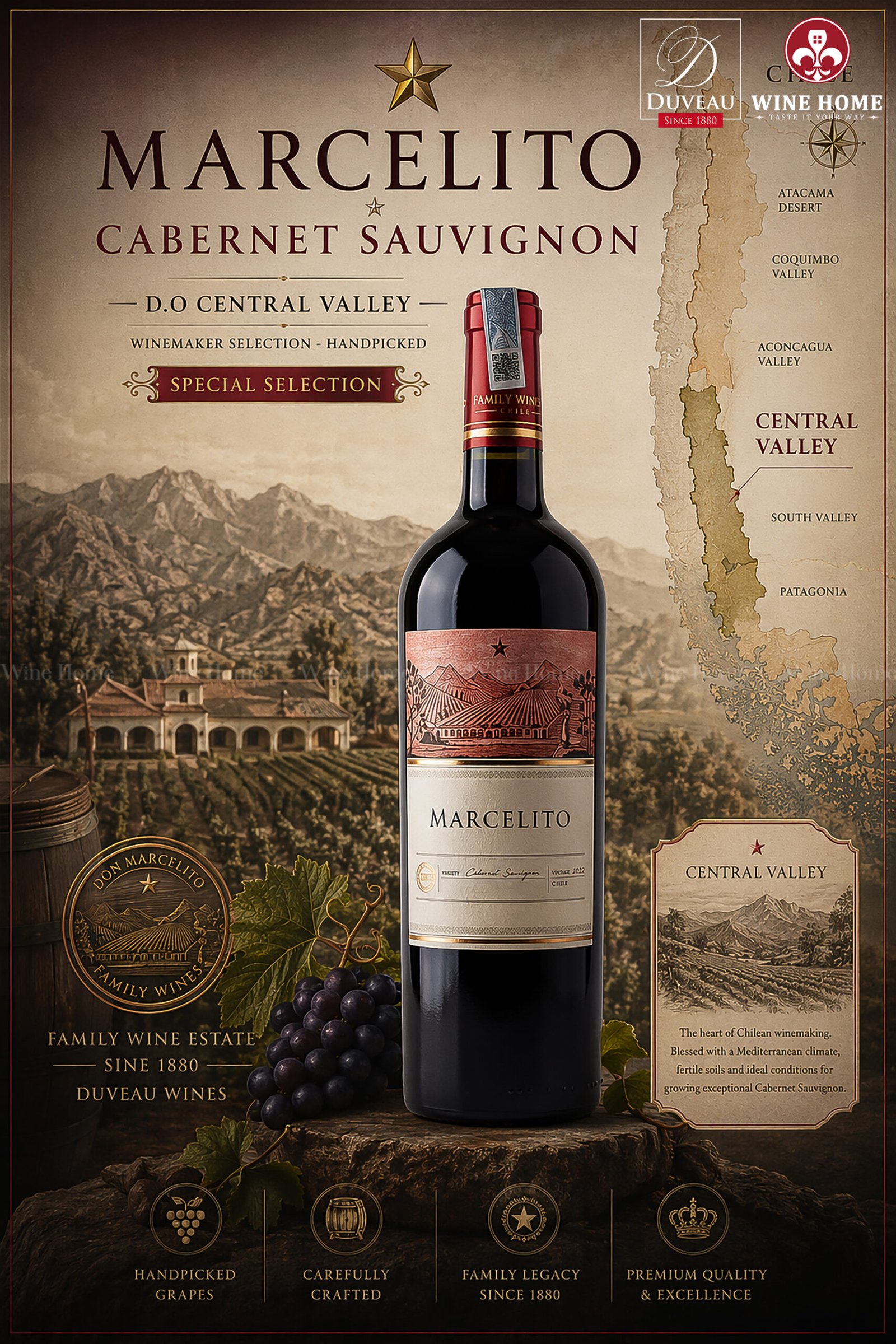 Marcelito Cabernet Sauvignon 2025 là chai vang đỏ tiêu biểu cho phong cách Chile hiện đại: đậm đà nhưng dễ tiếp cận, phù hợp cho cả thưởng thức hàng ngày và các dịp đặc biệt.