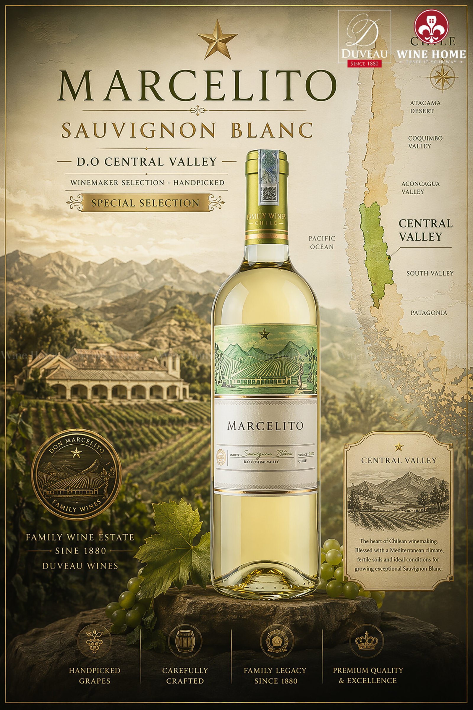 Marcelito Sauvignon Blanc 2025 là dòng vang trắng đến từ Central Valley, Chile, nổi bật với phong cách dry wine thanh nhẹ, nồng độ 12.5% dễ uống và phù hợp nhiều dịp sử dụng.
